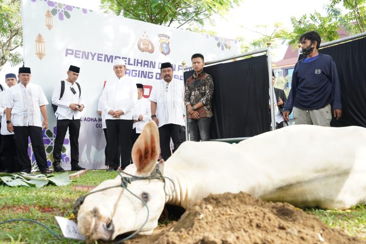 Selain itu, Polda Riau untuk pertama kalinya melaksanakan pemotongan lima ekor sapi kurban di halaman depan Mapolda Riau.