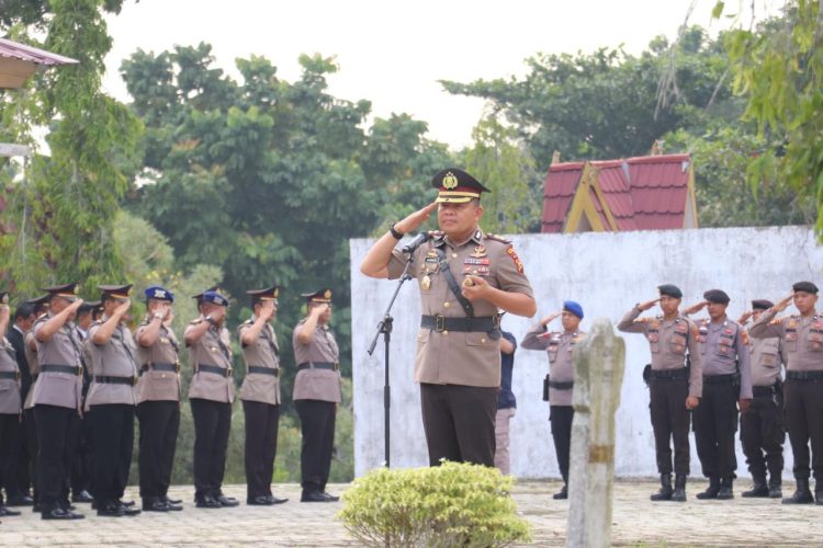 Kapolres Pelalawan, AKBP Suwinto SH SIK selaku Inspektur Upacara didampingi Wakapolres Kompol I Komang Aswatama SH SIK, Kabag Ops Kompol Maison SH, Kabag SDM Kompol Indra Rusdi SH dan PJU.