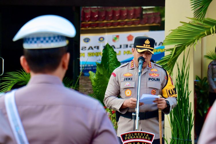 Apel gelar pasukan untuk memastikan kesiapan seluruh anggota dalam menjaga ketertiban lalu lintas di wilayah Pekanbaru.