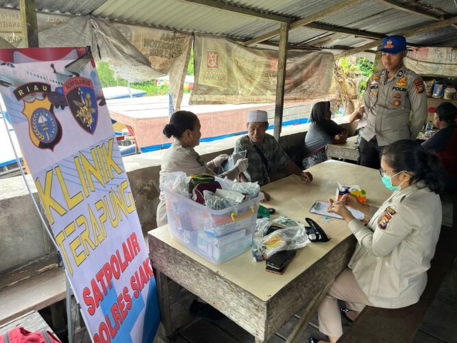 SIAK – Dalam upaya memeberikan pelayanan terbaik kepada masyarakat Satpolairud Polres Siak terus melakukan inovasi inovasi dibidang pelayanan salah satu nya dengan memberikan pelayanan kesehatan gratis melalui klinik terapung.