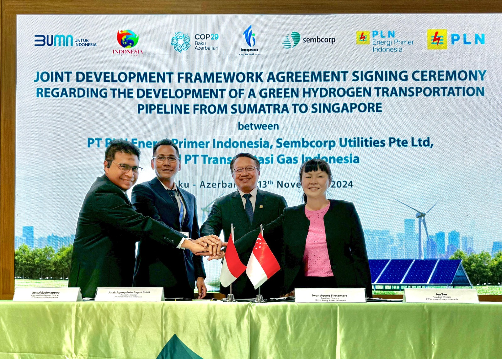Jakarta, 13 November 2024 – PT Transportasi Gas Indonesia (PT TGI), Sembcorp Utilities Pte Ltd. (Sembcorp), dan PT PLN Energi Primer Indonesia (PT PLN EPI) menandatangani Joint Development Framework Agreement (JDFA) pada tanggal 13 November 2024 di COP29 Baku, Azerbaijan.