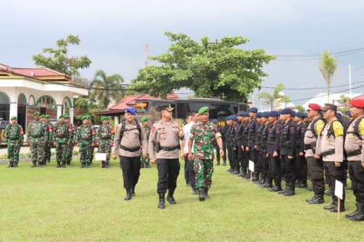 Upacara Pemberangkatan Personil Pengamanan TPS, BKO Sat Brimob, BKO Sat Samapta Polda Riau, dan Personil TNI dalam rangka Pengamanan Pilkada 2024 Operasi Mantap Praja Lancang Kuning 2024, Di pimpin langsung Kapolres Pelalawan Akbp Afrizal Asri, S.I.K.