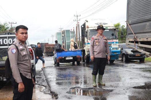 PELALAWAN – Kapolres Pelalawan, AKBP Afrixal Asri SIK bersama Kasat Lantas, AKP Enggarani Laufria SIK MSi turun langsung ke lokasi banjir di Jalan Lintas Timur KM 83 Desa Kemang Kecamatan Pangkalan Kuras, Minggu (9/3/2024).