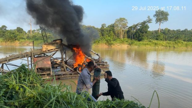 Setibanya di TKP, petugas menemukan dua unit rakit PETI dalam keadaan tidak beroperasi. Tanpa menunggu waktu lama, tim melakukan tindakan tegas dengan merusak dan membakar rakit-rakit tersebut agar tidak dapat digunakan kembali oleh pelaku tambang ilegal.