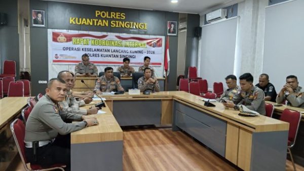KUANSING – Dalam rangka menciptakan keamanan, keselamatan, ketertiban dan kelancaran lalu lintas (Kamseltibcarlantas) menjelang bulan suci Ramadan 1447 Hijriah, Polres Kuantan Singingi menggelar Rapat Koordinasi Internal terkait Operasi Keselamatan Lancang Kuning Tahun 2026. Kegiatan tersebut dilaksanakan bertempat di Ruang Rupatama Polres Kuansing, Selasa (27/1/2026).