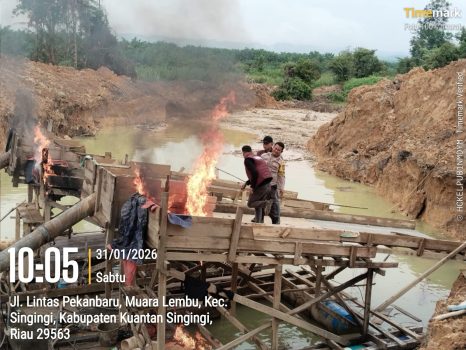KUANSING – Polsek Singingi melaksanakan kegiatan penertiban PETI di Kelurahan Muara Lembu, Kecamatan Singingi, Kabupaten Kuantan Singingi, Sabtu pagi (31/1/2026).