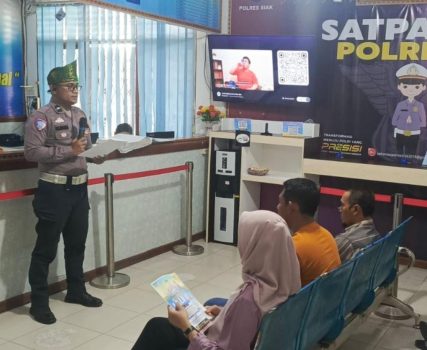 SIAK – Memasuki hari ke-5 pelaksanaan Operasi Keselamatan Lancang Kuning 2026, Satuan Lalu Lintas Polres Siak menggelar sosialisasi dan pembagian leaflet kepada masyarakat di Kantor Satpas SIM Perawang, Kecamatan Tualang, Jumat (6/2/2026).