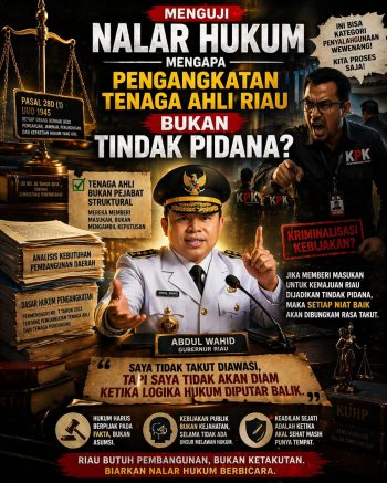Narasi yang dibangun oleh Jaksa Penuntut Umum (JPU) seolah-olah ingin menggiring opini publik bahwa kebijakan pengangkatan tersebut adalah sebuah “perbuatan melawan hukum” hanya karena tidak lagi dianggarkan dalam APBD Riau sejak tahun 2025.